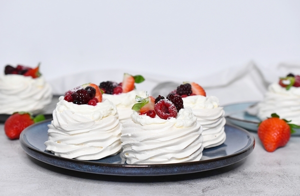 Ez a torta még a legigényesebb ínyenceknek is örömet okoz. Ropogós tojásfehérje-kéregből, puha közepéből, tejszínhabból és sok friss bogyós gyümölcsből áll. Egy kis odafigyelést és több előkészítési időt igényel, mivel a sütési hőmérsékletnek alacsonyabbnak kell lennie, ha hófehér akar maradni. Én porciótortát készítettem, mert jobban szeretem, de a hozzávalókból egy nagyobb tortát is lehet készíteni. A receptben szereplő hozzávalók 6 kis tortához vagy egy nagy, 20 cm átmérőjű tortához elegendőek.