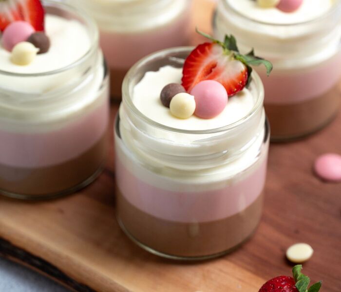 @bamchocolate.com Recreate the taste of ice cream nostalgia! ? Get lost in a chocolate paradise that you will experience with every bite of chocolate mousse. INGREDIENTS: 510 g whipping cream 135 g BAM milk chocolate 135 g BAM strawberry chocolate 135 g BAM white chocolate 6 gelatine sheets Garnish as desired (e.g. fresh strawberries, chocolate chips, biscuits) RECIPE: STEP 1 Whip 120 g cream until smooth. STEP 2. Soak the gelatine sheets in cold water and leave for 10 minutes. STEP 3 Melt the milk chocolate and stir in 50 g of warm cream to make a smooth mixture. Stir until the chocolate is completely melted. STEP 4 Add the grated melted gelatine to the warm chocolate mixture and mix well. Immediately afterwards, gently fold in the whipped cream. STEP 5 Prepare the jars and fill them with the chocolate mousse. Place them in the fridge. STEP 6 Repeat the process with BAM strawberry and BAM white chocolate. This creates beautiful multi-coloured layers. STEP 7 Leave the desserts in the fridge for a few hours to set the mousse. Before serving, decorate the glasses as desired - for example with fresh strawberries, chocolate chips or whipped cream. Enjoy! ✨ #chocolatemousse #mousse #chocoholic #desserttiktok #bamchocolate