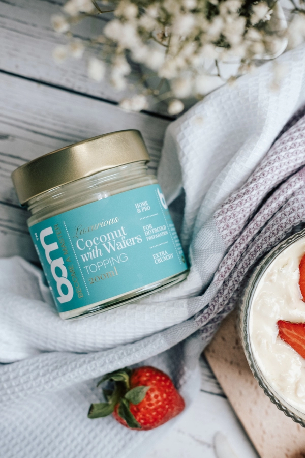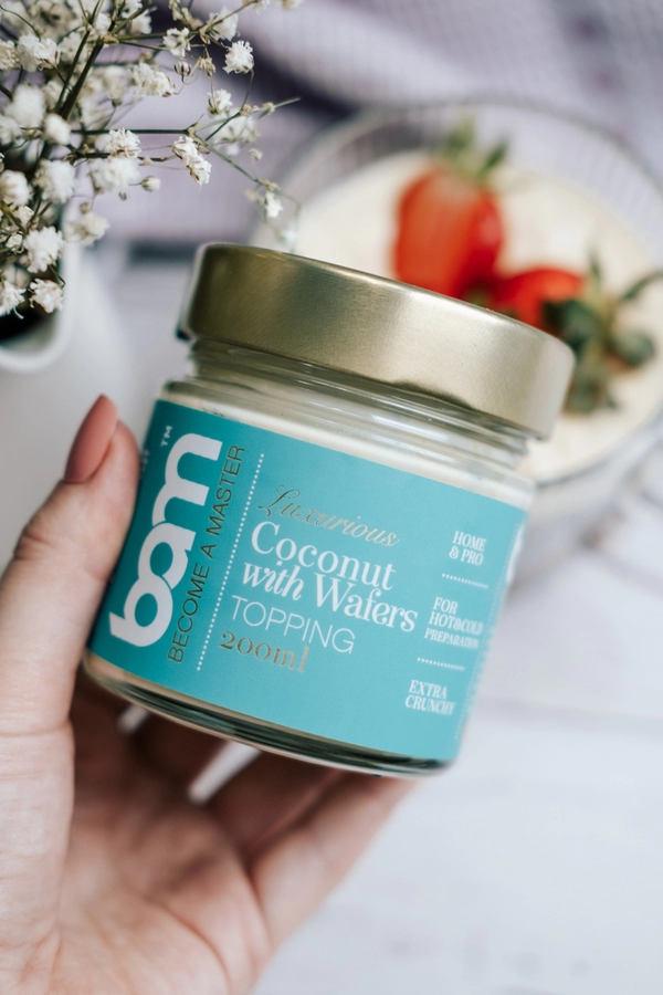 A BAM Kókusz ostyával (200 ml) a fehér csokoládé és az egzotikus kókuszreszelék jellegzetes ízével nyűgöz le. Az ízletes és ropogós ostyákat a finom krémhez adjuk, ami tovább gazdagítja a feltét ízét és állagát. A fehér csokoládé, a kókuszreszelék és a ropogós ostyák kombinációja krémes szerkezetet hoz létre, amely különböző desszertek töltelékeként is remekül használható. Enyhén egzotikus ízével gazdagítja a fagylalt ízét. Elmaradhatatlan kiegészítője lesz a palacsinták töltelékének vagy a croissantok töltelékeként. Készíthet belőle híres pálcikás süteményeket , vagy egyszerűen csak kenheti kenyérre.